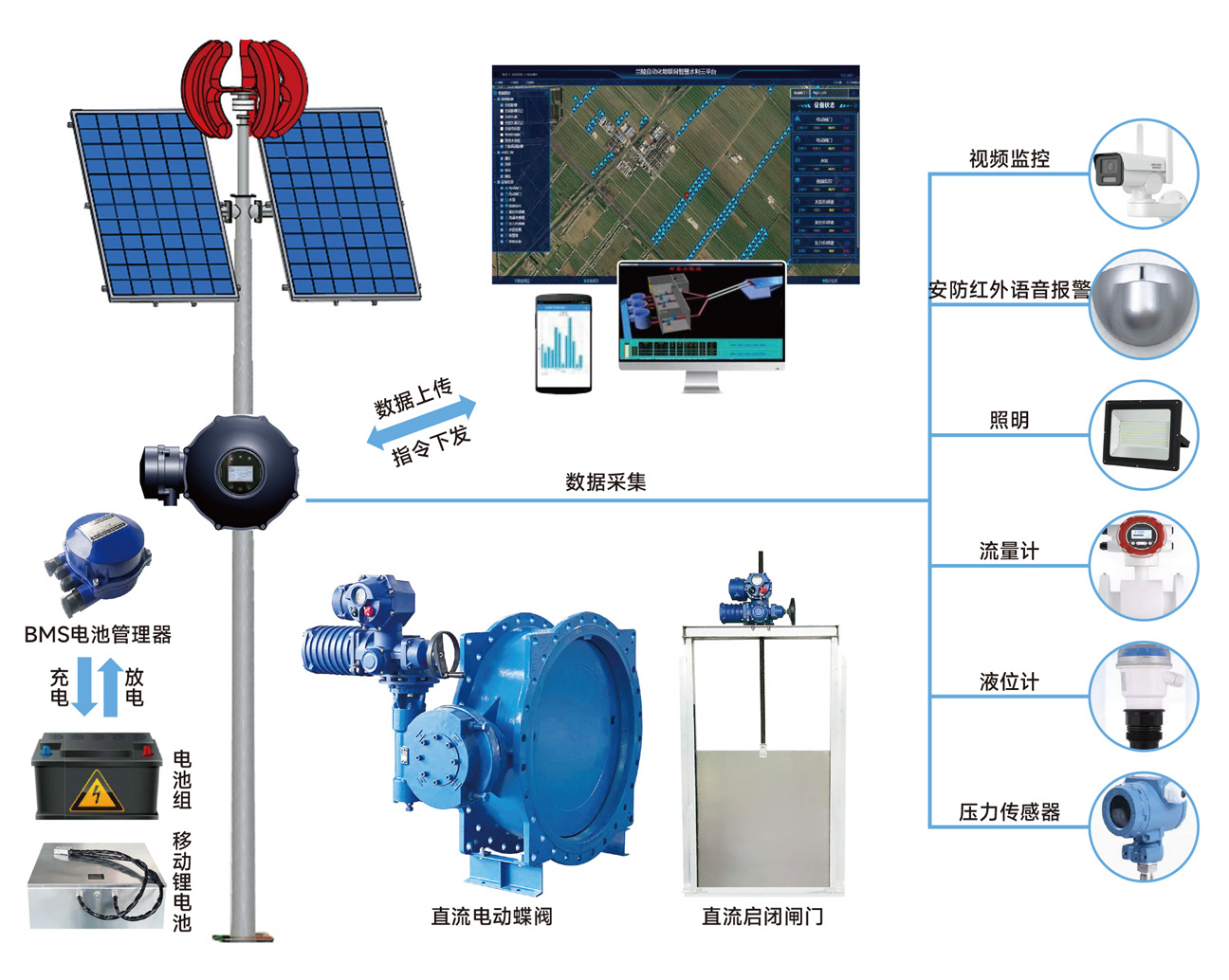 由太陽能光伏板和小型風(fēng)力發(fā)電機(jī)為蓄能電池組充電,電池組有BMS電池管理軟件管控,為永磁無刷直流電機(jī)的各類驅(qū)動(dòng)裝置供電,同時(shí)為視頻監(jiān)控,壓力、流量、液位傳感器,照明等供電